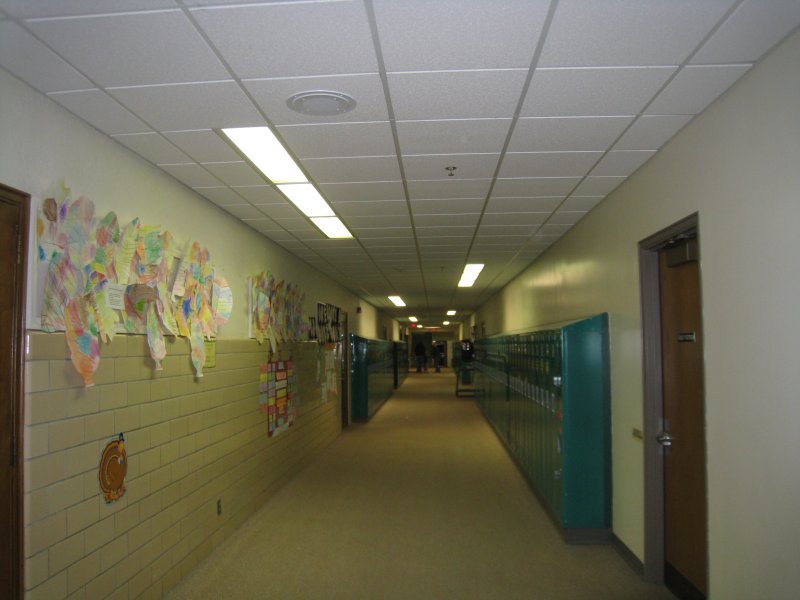 First floor hallway, from the gym toward the kindergarten room.