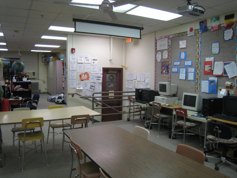 | The balcony has been walled off and is now a classroom. Note the tables